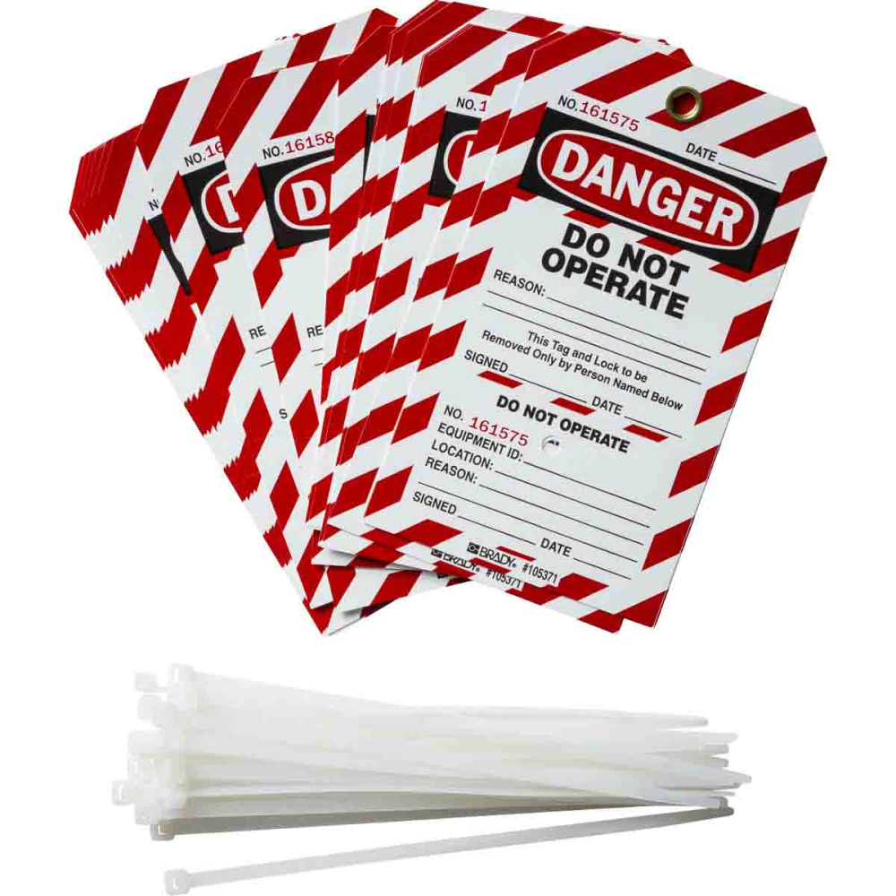 Tweedelige geperforeerde tags. Tweedelige tags bieden een verbeterde operationele controle en administratie. De strook wordt verwijderd na bevestiging van de tag aan een vergrendelingspunt. Alleen de werknemer die in bezit is van de strook, is bevoegd om de tag te verwijderen. Na beëindiging van het werk wordt de strook ingediend bij het management voor verificatie en controle van de Lockout/Tagout-activiteiten in het bedrijf. Op elk deel zijn overeenkomstige identificatienummers geprint. Beschrijfbaar oppervlak voor markeerstift, pen of potlood. Geschikt voor binnen- en buitengebruik. Nylon kabelbandjes meegeleverd voor eenvoudige, veilige bevestiging.