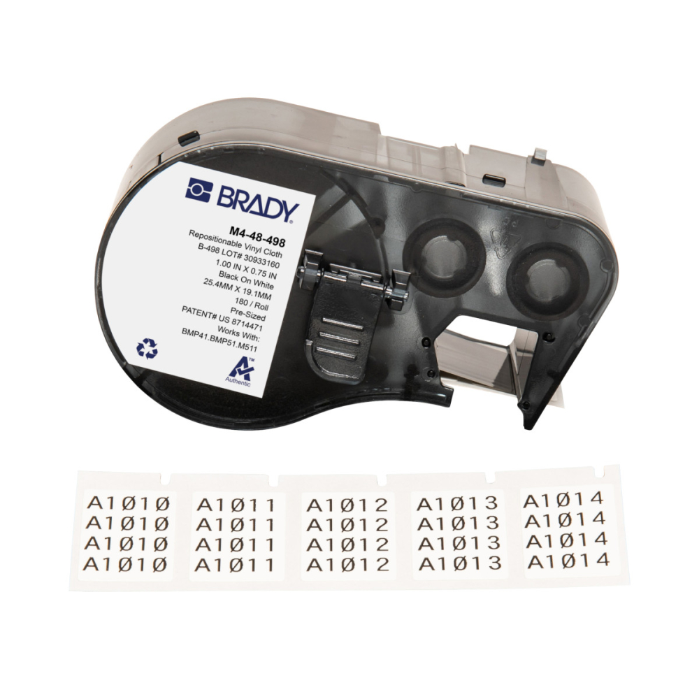 M4-48-498 | Halfglanzend Zwart op wit Vinylweefsel met afmeting: 25,40 mm (B) x 19,05 mm (H)
