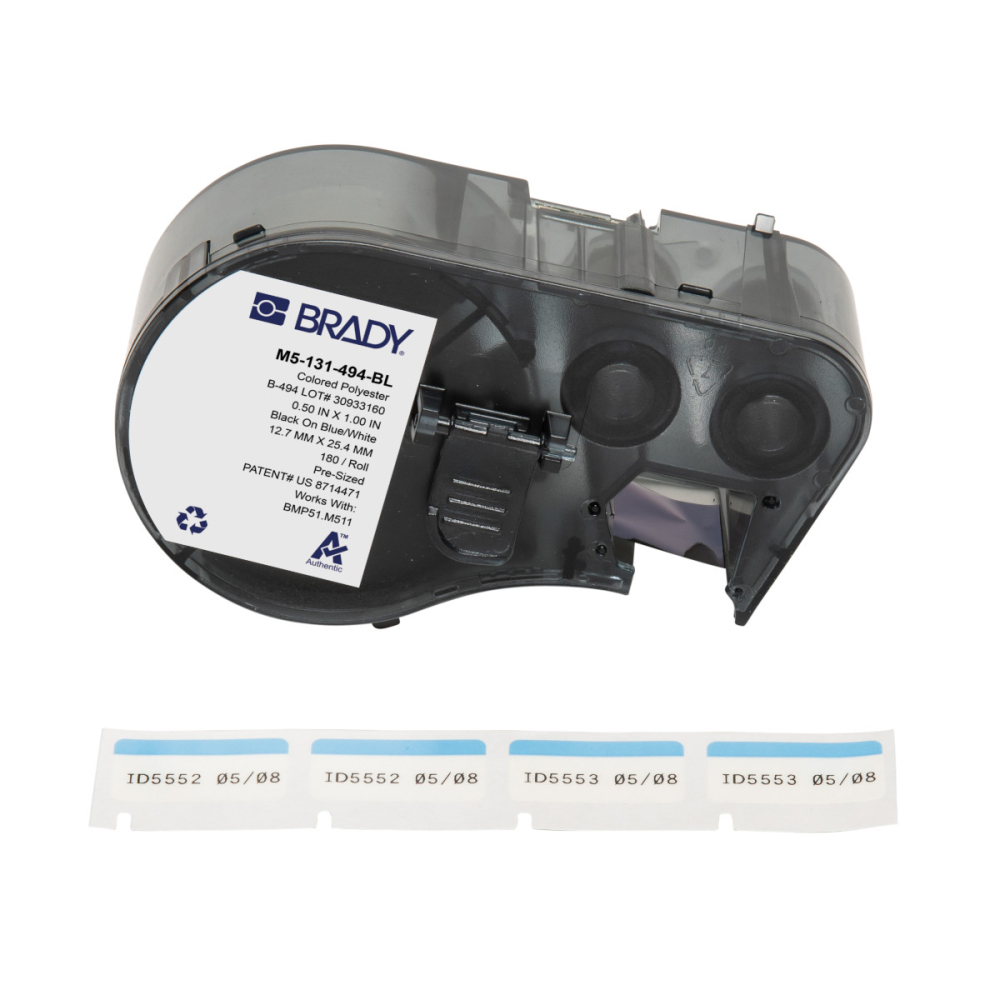 M5-131-494-BL | Glanzend Zwart op blauw, wit Polyester met afmeting: 25,40 mm (B) x 12,70 mm (H)