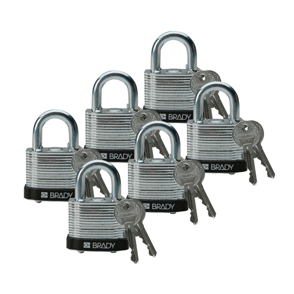 De stalen Brady-hangsloten zijn vervaardigd in versterkt gelamineerd staal zodat ze bestand zijn tegen extreem fysiek geweld, en zijn voorzien van een beugel in gehard staal die hen moeilijk door te knippen maakt. De lagen van de behuizing zijn afzonderlijk gecoat voor een superieure roestvastheid. De cilinder met 5 stiften biedt meer unieke sleutelvarianten en is beter beveiligd tegen manipulatie dan conventionele sloten met 4 stiften. Gekleurde stootbandjes beschikbaar voor identificatie en bescherming, en gepersonaliseerde labeling is verkrijgbaar. Hangsloten zijn Keyed Different verkrijgbaar. Sleutelblokkering (sleutel kan niet uit het slot worden verwijderd voor het hangslot goed gesloten is) Andere sleutelsystemen en registratie zijn mogelijk. Vergrendelingslabels worden afzonderlijk verkocht.