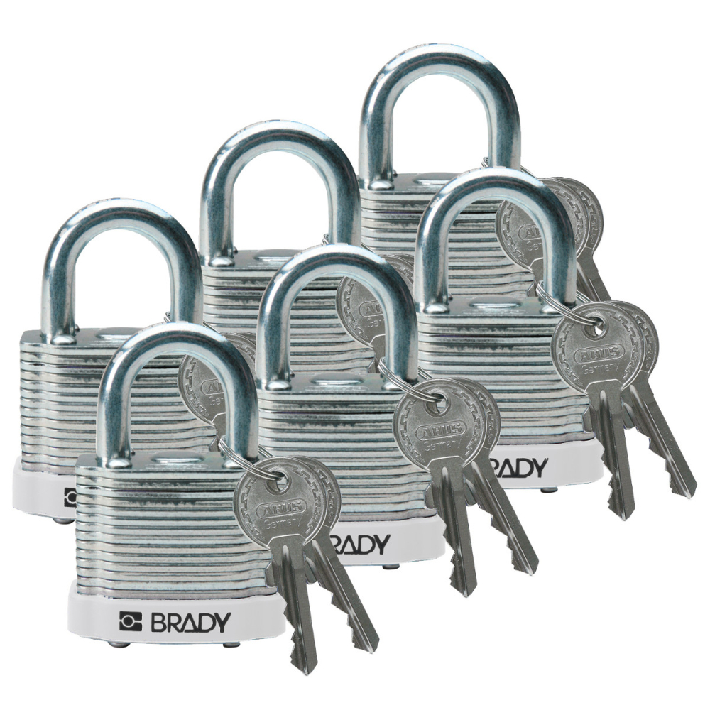De stalen Brady-hangsloten zijn vervaardigd in versterkt gelamineerd staal zodat ze bestand zijn tegen extreem fysiek geweld, en zijn voorzien van een beugel in gehard staal die hen moeilijk door te knippen maakt. De lagen van de behuizing zijn afzonderlijk gecoat voor een superieure roestvastheid. De cilinder met 5 stiften biedt meer unieke sleutelvarianten en is beter beveiligd tegen manipulatie dan conventionele sloten met 4 stiften. Gekleurde stootbandjes beschikbaar voor identificatie en bescherming, en gepersonaliseerde labeling is verkrijgbaar. Hangsloten zijn Keyed Different verkrijgbaar. Sleutelblokkering (sleutel kan niet uit het slot worden verwijderd voor het hangslot goed gesloten is) Andere sleutelsystemen en registratie zijn mogelijk. Vergrendelingslabels worden afzonderlijk verkocht.