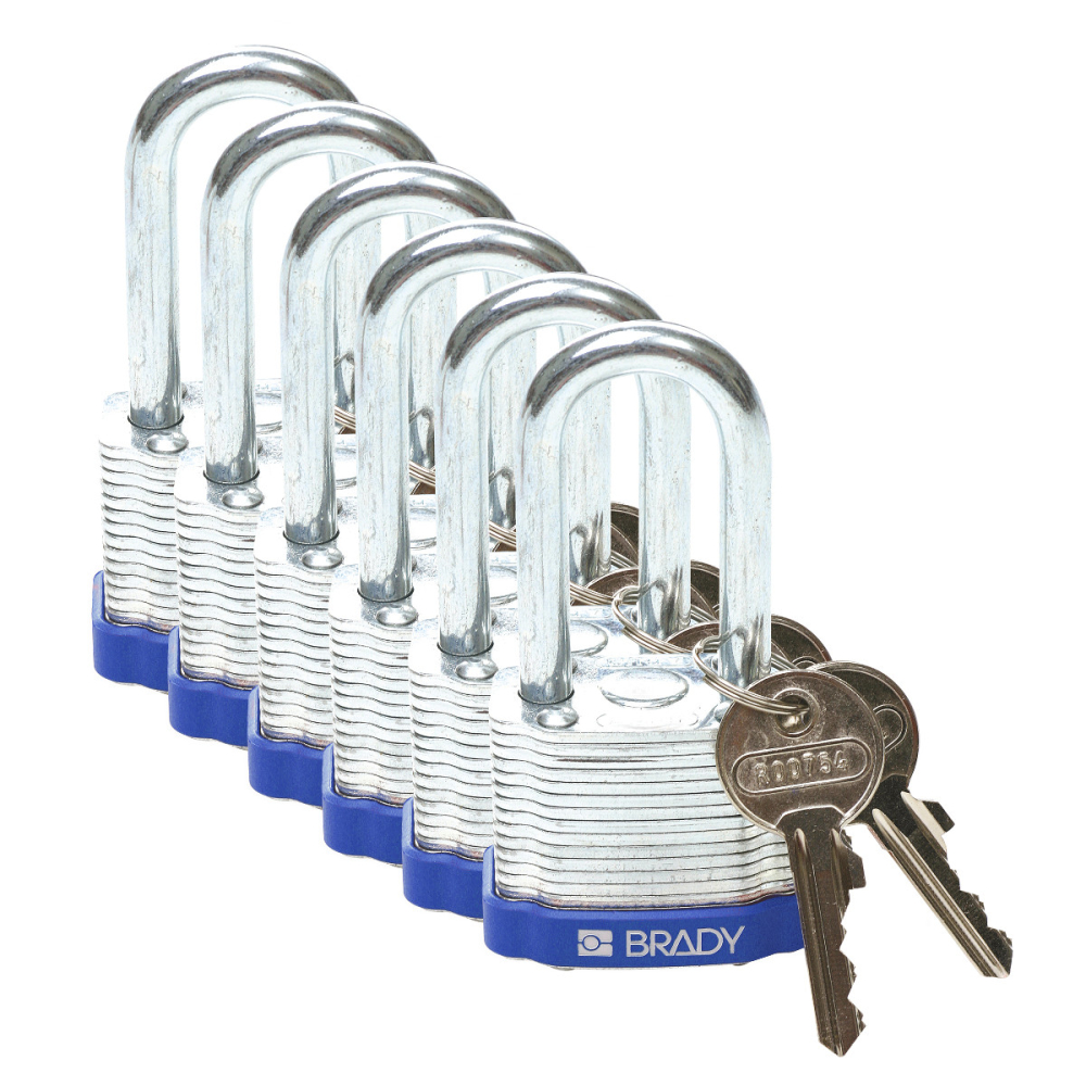 De stalen Brady-hangsloten zijn vervaardigd in versterkt gelamineerd staal zodat ze bestand zijn tegen extreem fysiek geweld, en zijn voorzien van een beugel in gehard staal die hen moeilijk door te knippen maakt. De lagen van de behuizing zijn afzonderlijk gecoat voor een superieure roestvastheid. De cilinder met 5 stiften biedt meer unieke sleutelvarianten en is beter beveiligd tegen manipulatie dan conventionele sloten met 4 stiften. Gekleurde stootbandjes beschikbaar voor identificatie en bescherming, en gepersonaliseerde labeling is verkrijgbaar. Hangsloten zijn Keyed Different verkrijgbaar. Sleutelblokkering (sleutel kan niet uit het slot worden verwijderd voor het hangslot goed gesloten is) Andere sleutelsystemen en registratie zijn mogelijk. Vergrendelingslabels worden afzonderlijk verkocht.