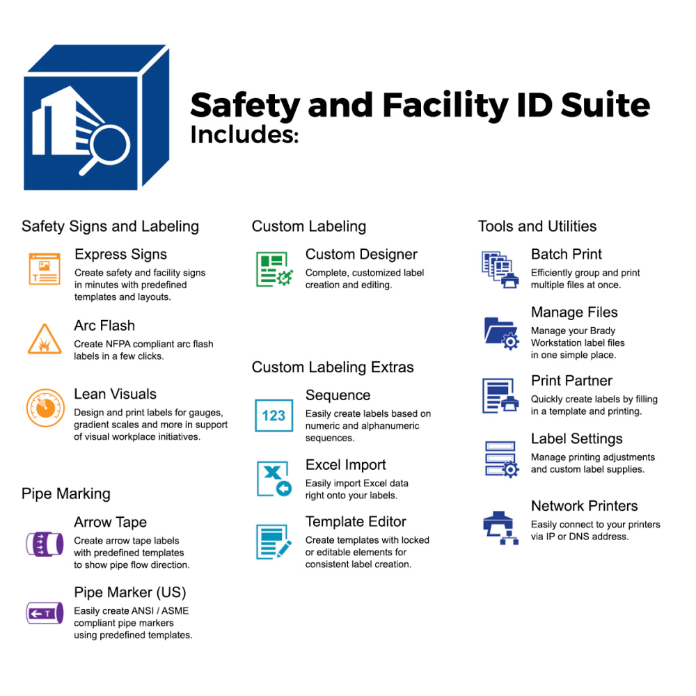 - Wordt geleverd met een licentie voor de Brady Workstation-suite van uw voorkeur: Productidentificatie en draadmarkering, Veiligheids- en site-identificatie of Laboratoriumidentificatie, waarmee u eenvoudig een uitgebreid assortiment labels en pictogrammen kunt maken.